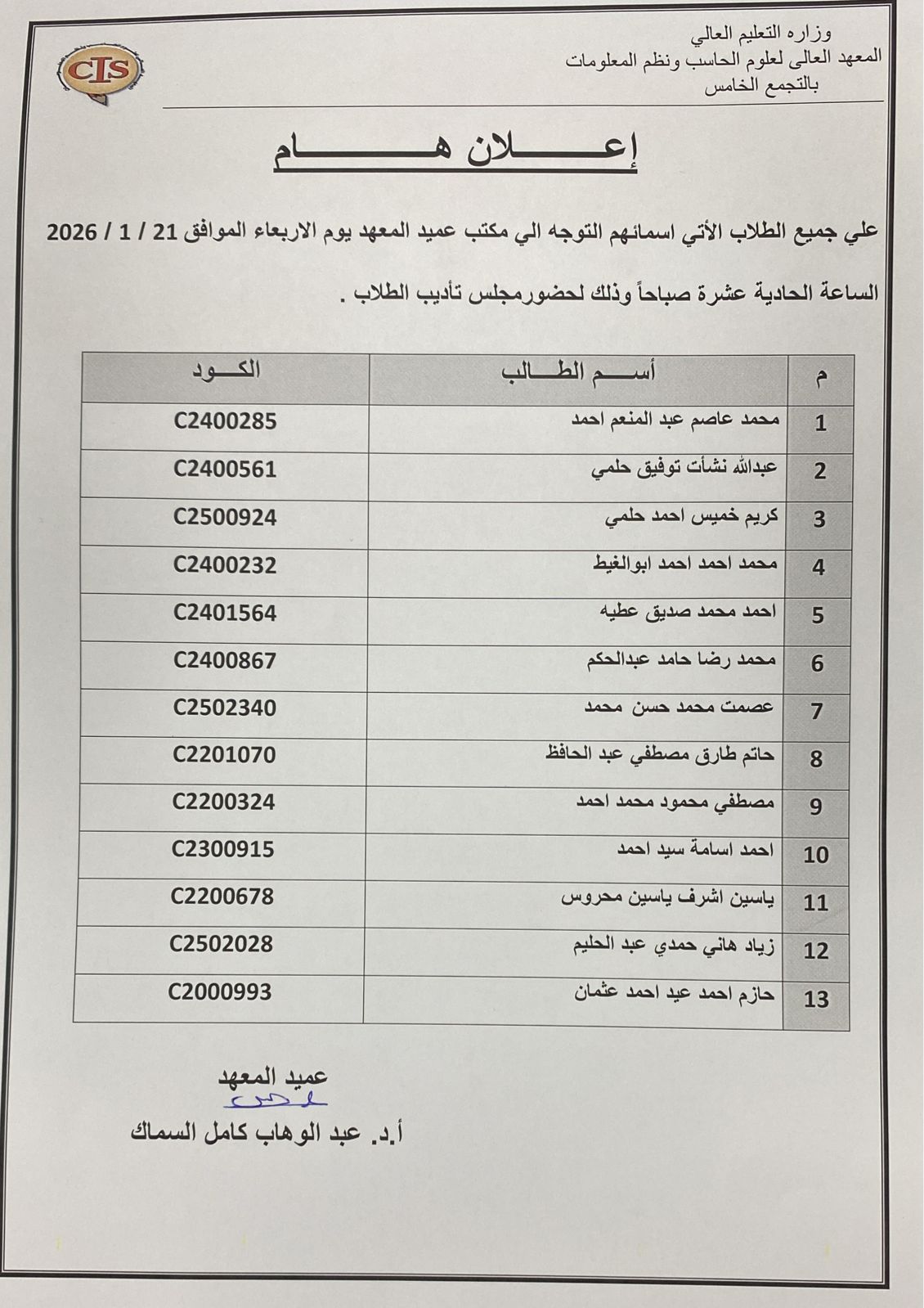 علي جميع الطلاب الأتي أسمائهم التوجه الي مكتب العميد يوم الأربعاء الموافق 21/1/2026 الساعة الحادية عشرة صباحا وذلك لحضور مجلس التأديب لمعرفة الاسماء انظر الكشف بالاسفل