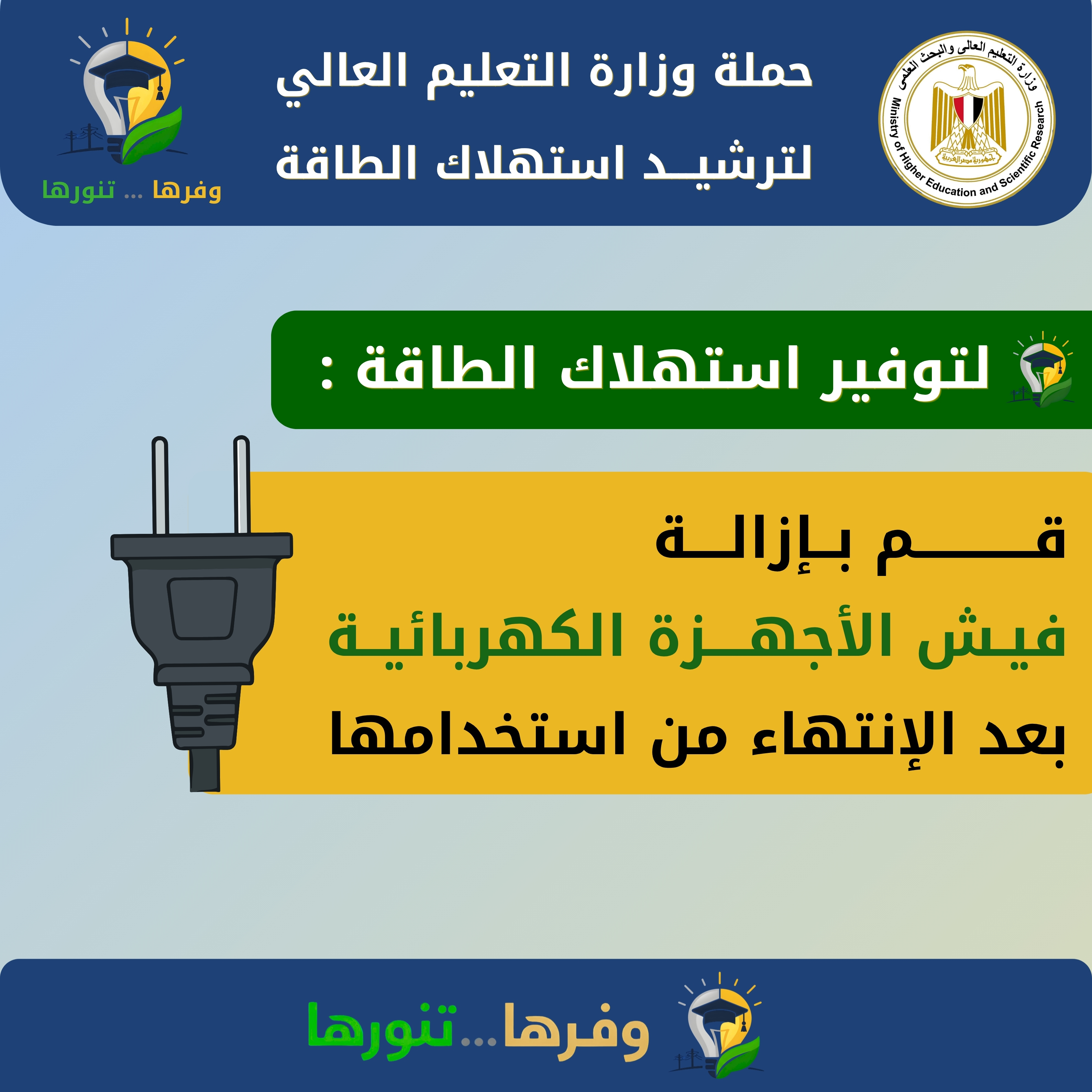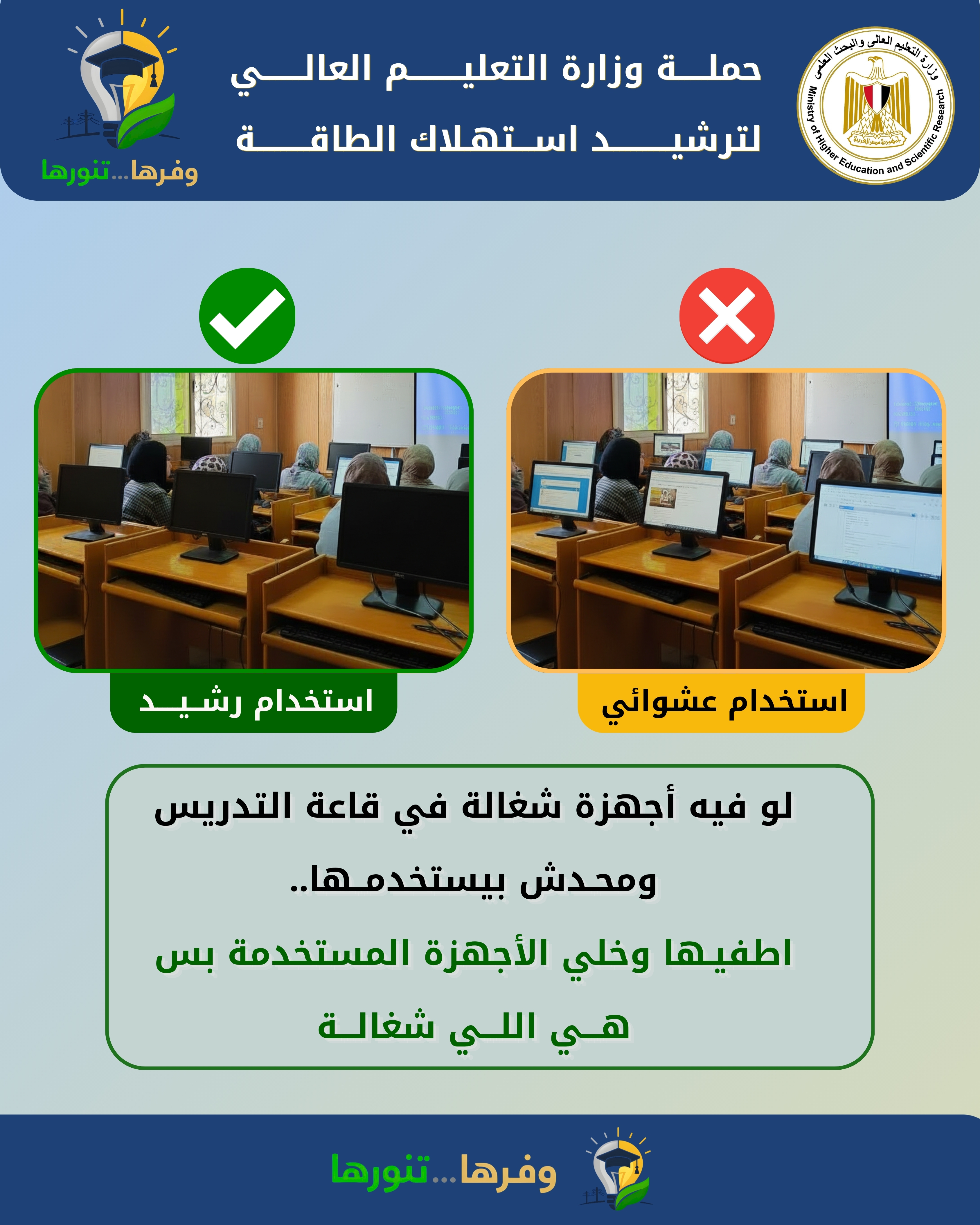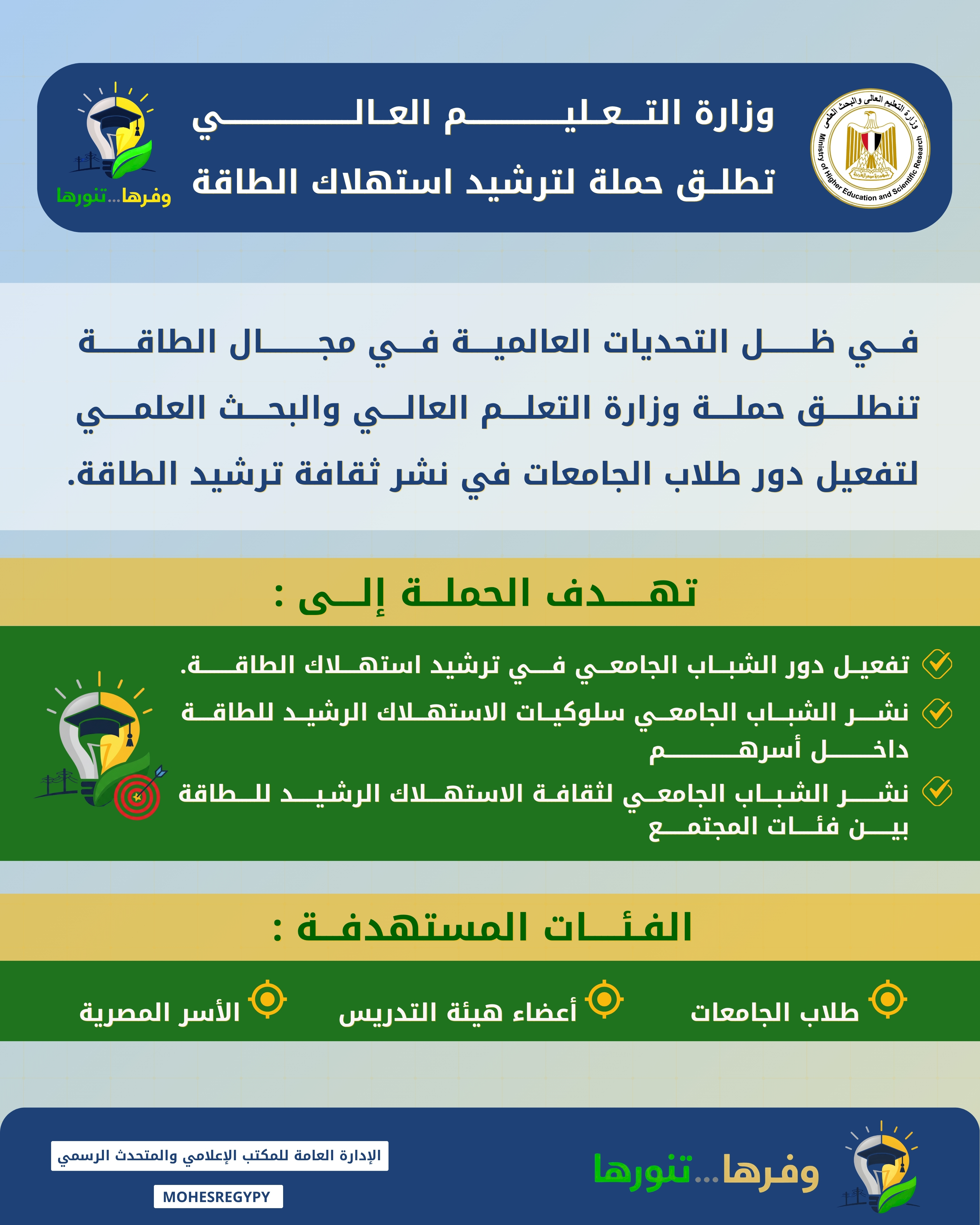 - وفقًا لتوجيهات وزارة التعليم العالي، وفي ظل التحديات العالمية في مجال الطاقة، تنطلق حملة لتفعيل دور طلاب الجامعات في نشر ثقافة ترشيد الطاقة.